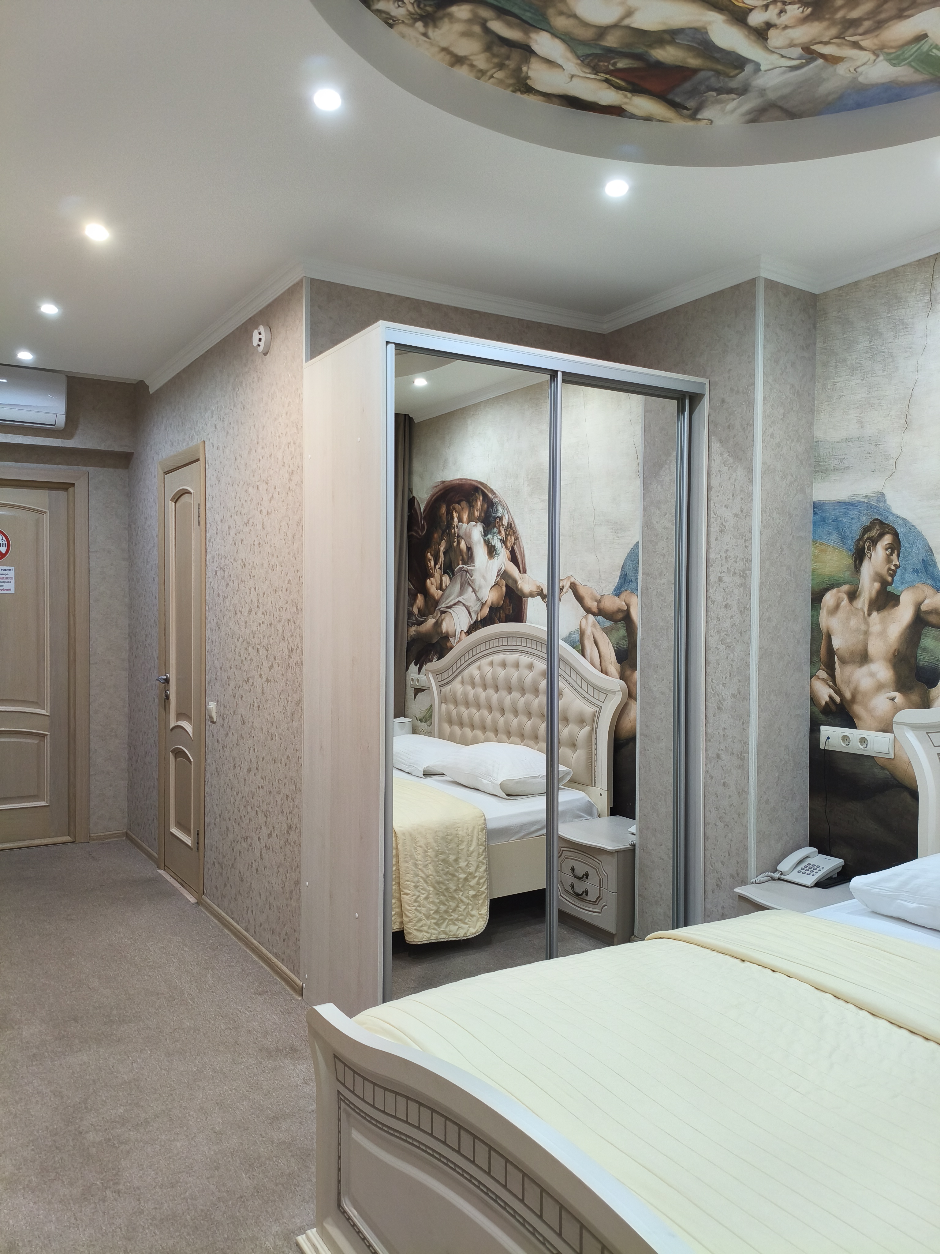 двуспальная кровать, шкаф — купе для одежды, прикроватные тумбочки;