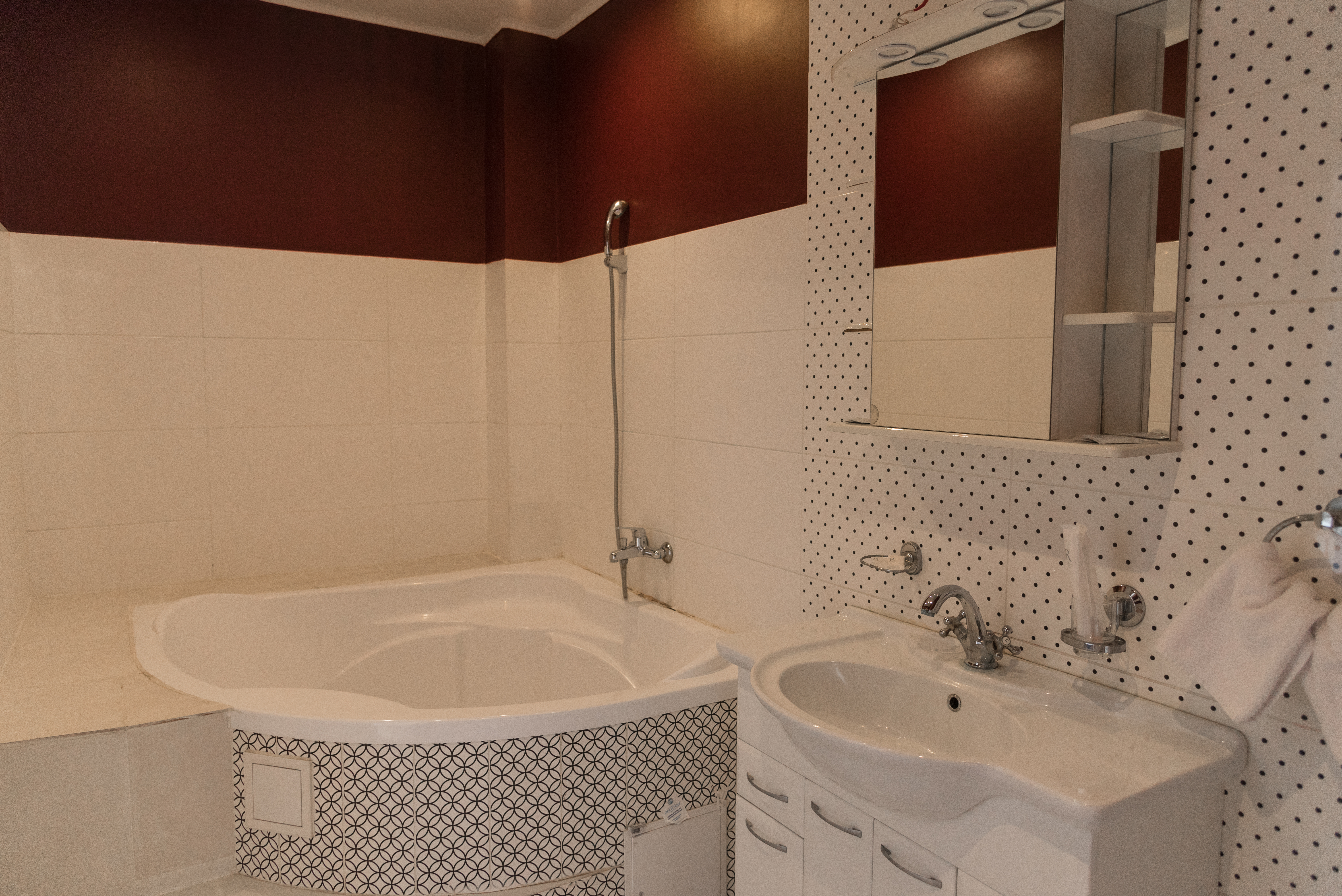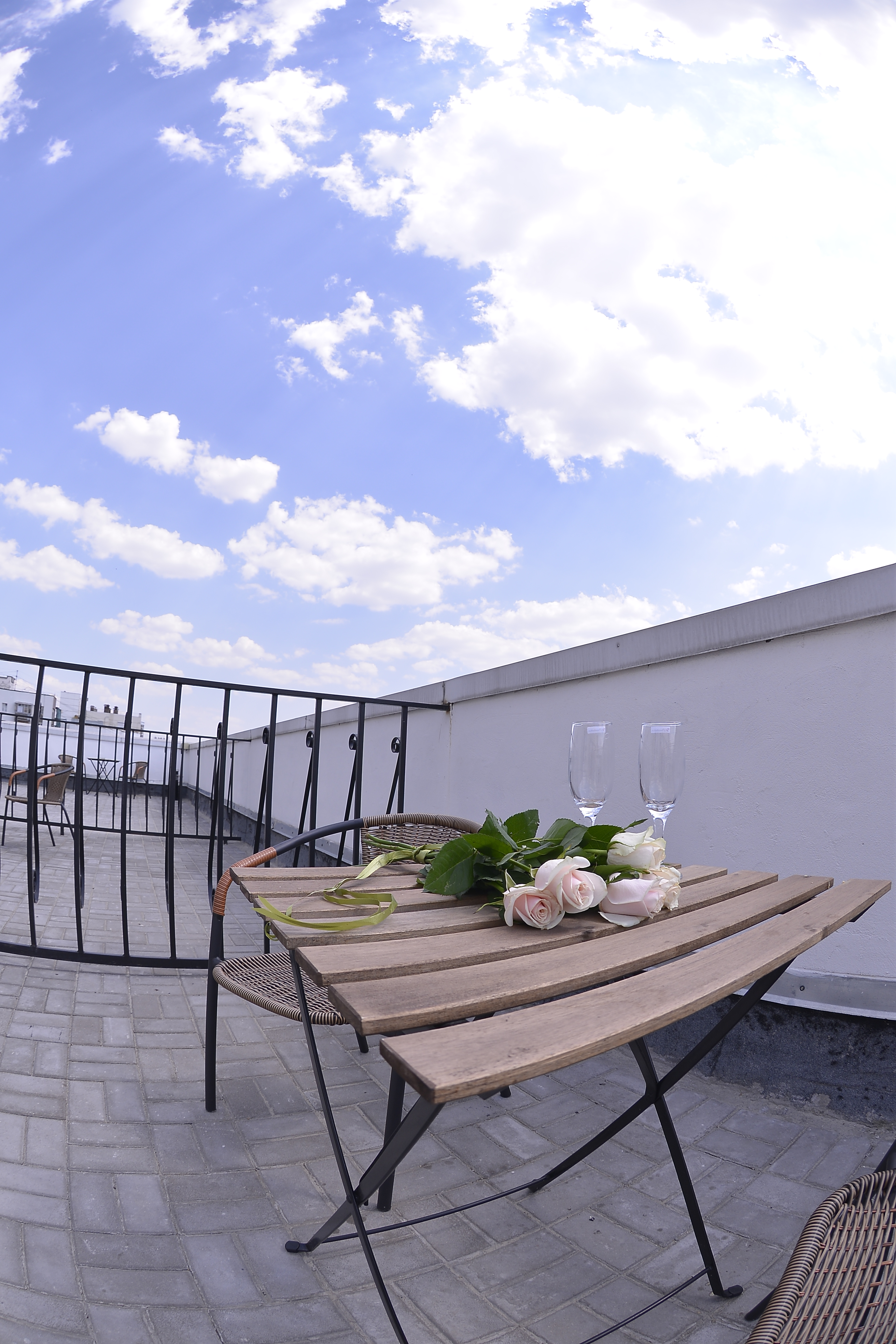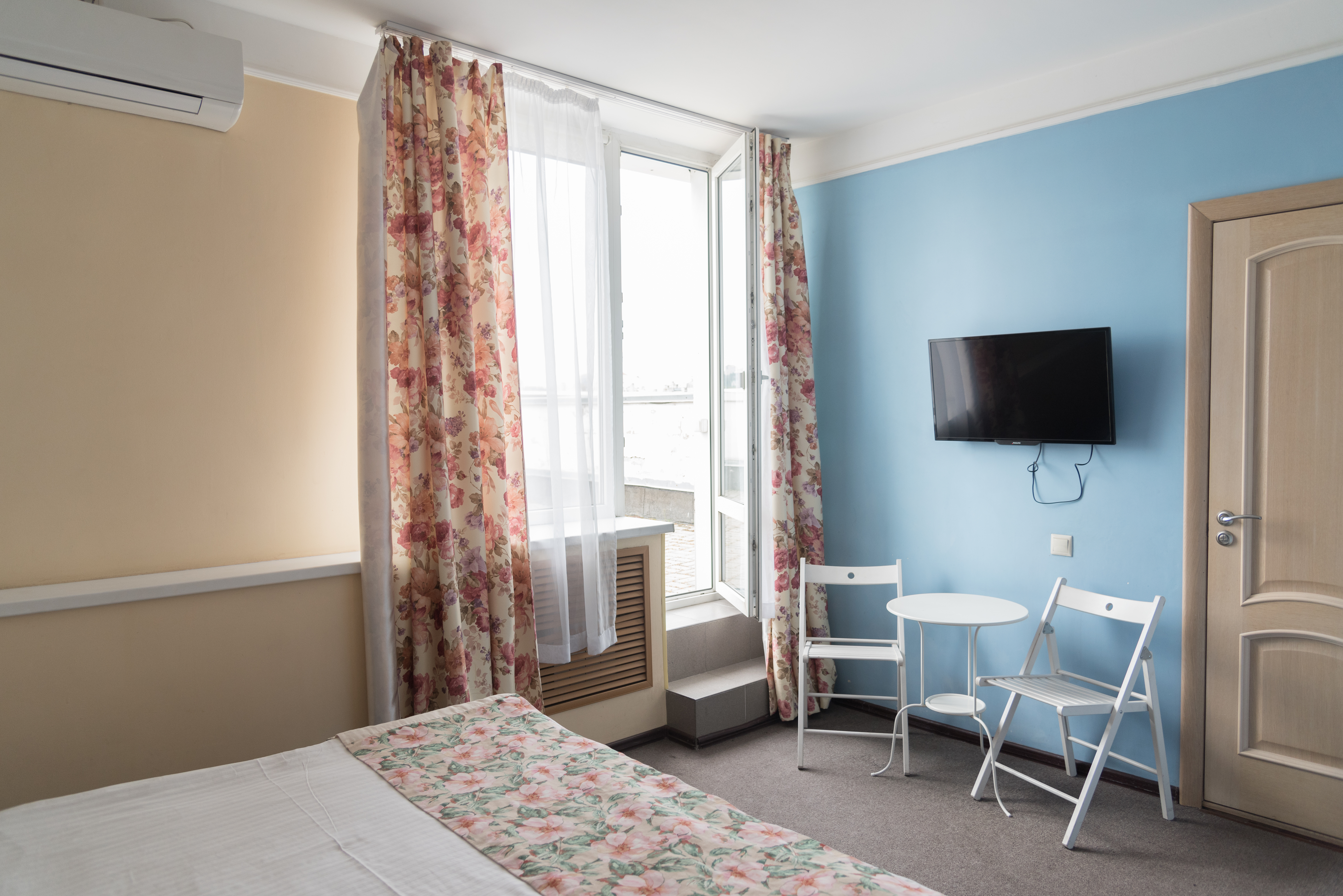 номер находится на 7 этаже, при выходе из номера на собственную террасу открывается панорамный вид на город, там имеется столик со стульями для приятного отдыха под открытым небом.